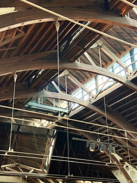 Ursprüngliche Merkmale wie laminierte Dachbalken und Haken für Kletterseile sind noch heute sichtbar und bewahren das sportliche Erbe des Gebäudes.